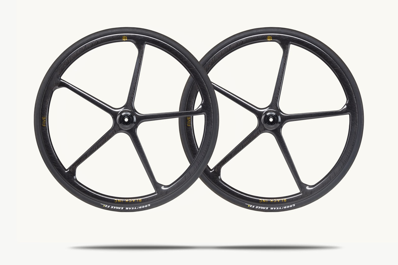 El juego de ruedas Black Inc FIVE's, elaborado a mano con radios sólidos de carbono, encarna el nivel más alto de ingeniería y diseño de la marca. Su construcción monocasco —que integra aro y radios en una sola pieza— ofrece una ligereza excepcional junto con una ventaja aerodinámica que tradicionalmente solo alcanzaban las ruedas más profundas y pesadas.